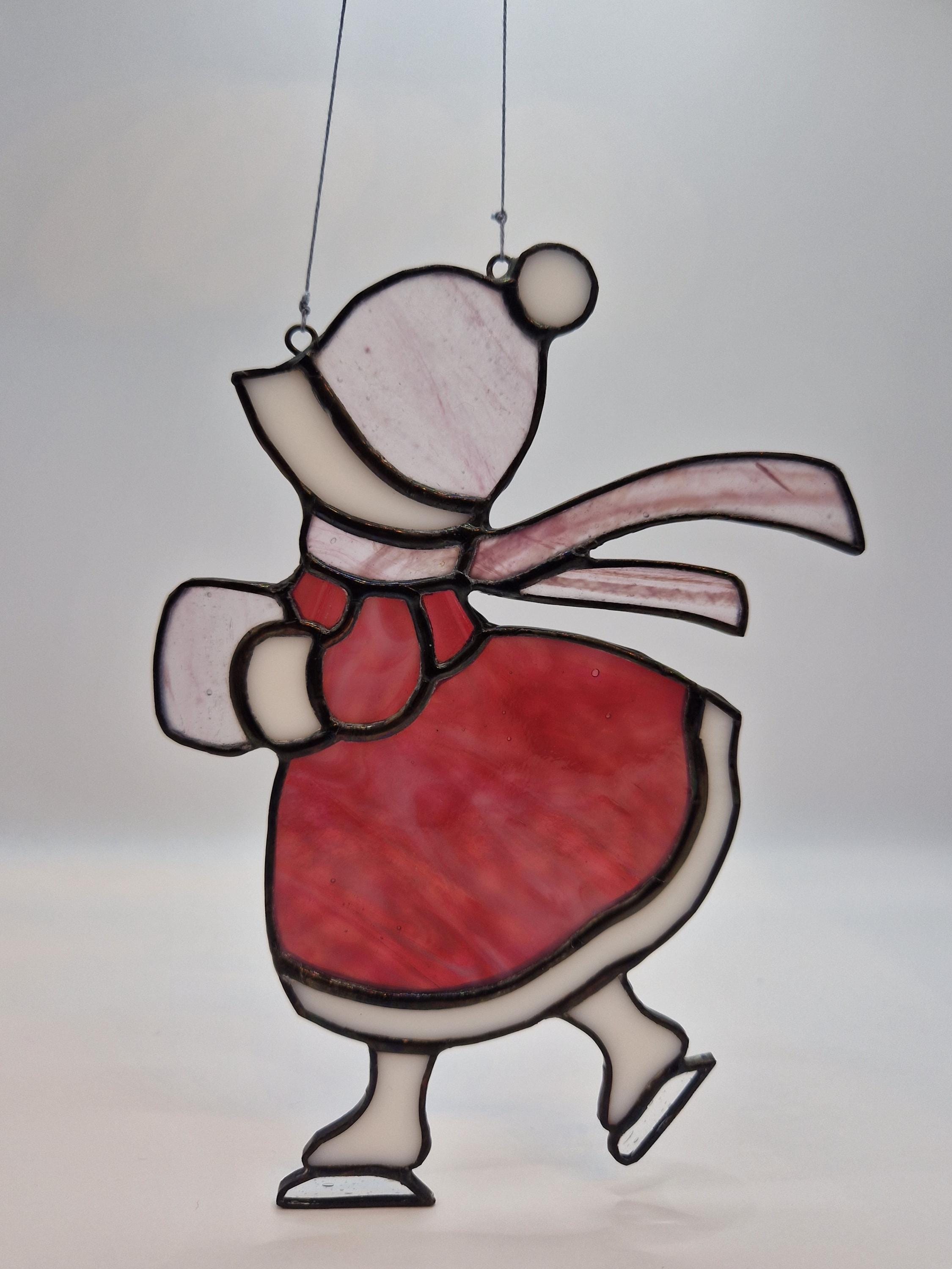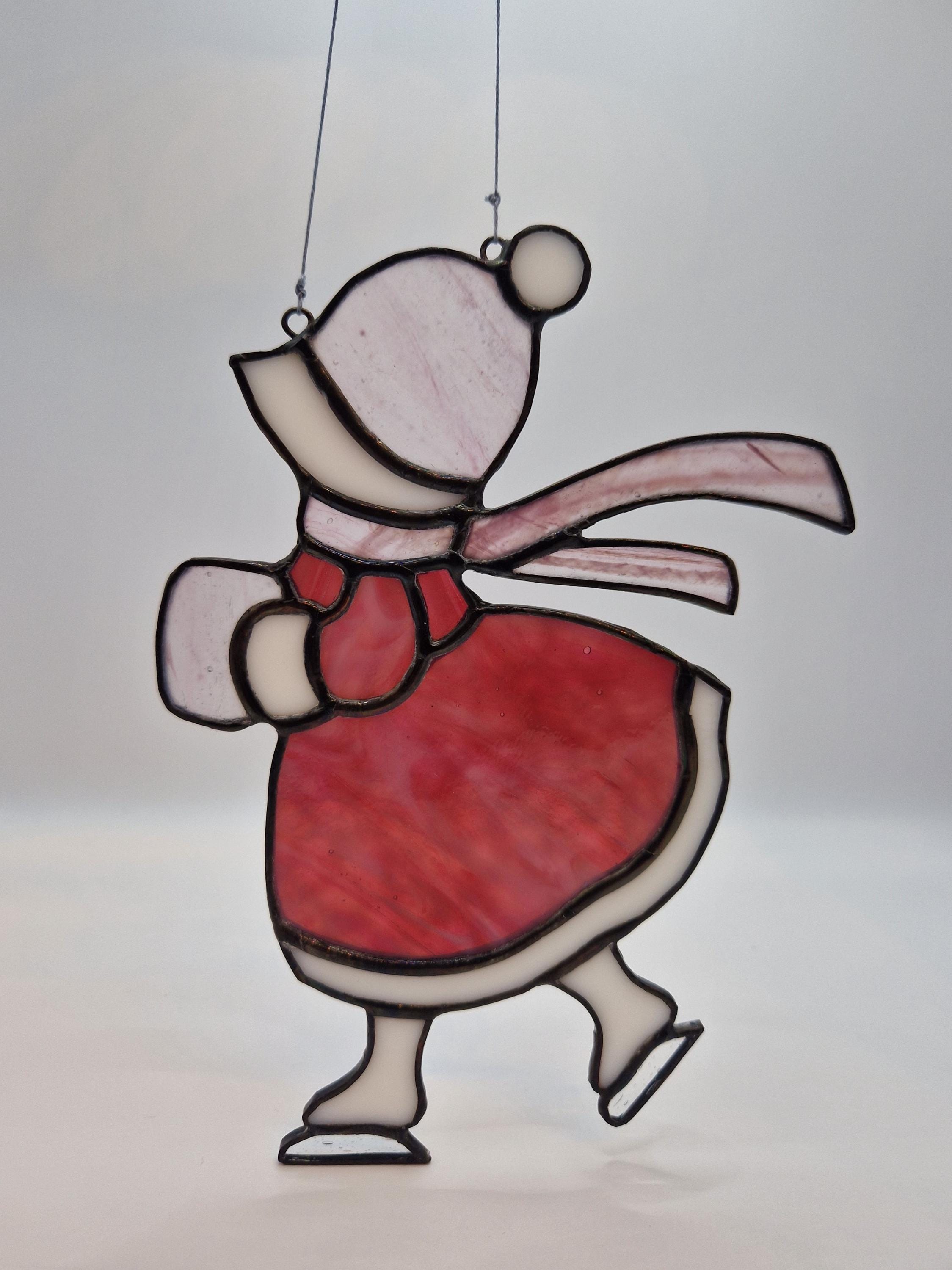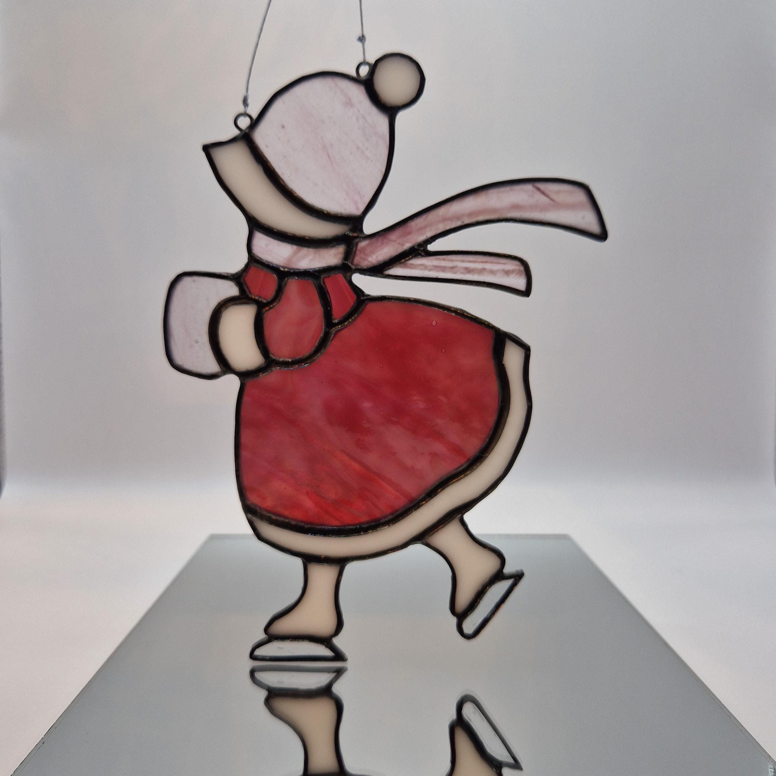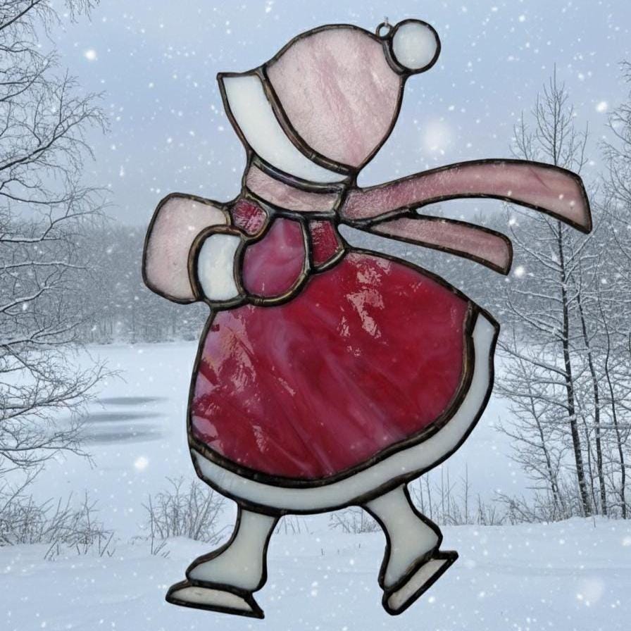 A nostalgic stained glass suncatcher featuring a Victorian girl skating through a winter scene. Handcrafted with antique -style charm, this piece adds warmth and elegance to any window- perfect as a seasonal gift or vintage-inspired decor.