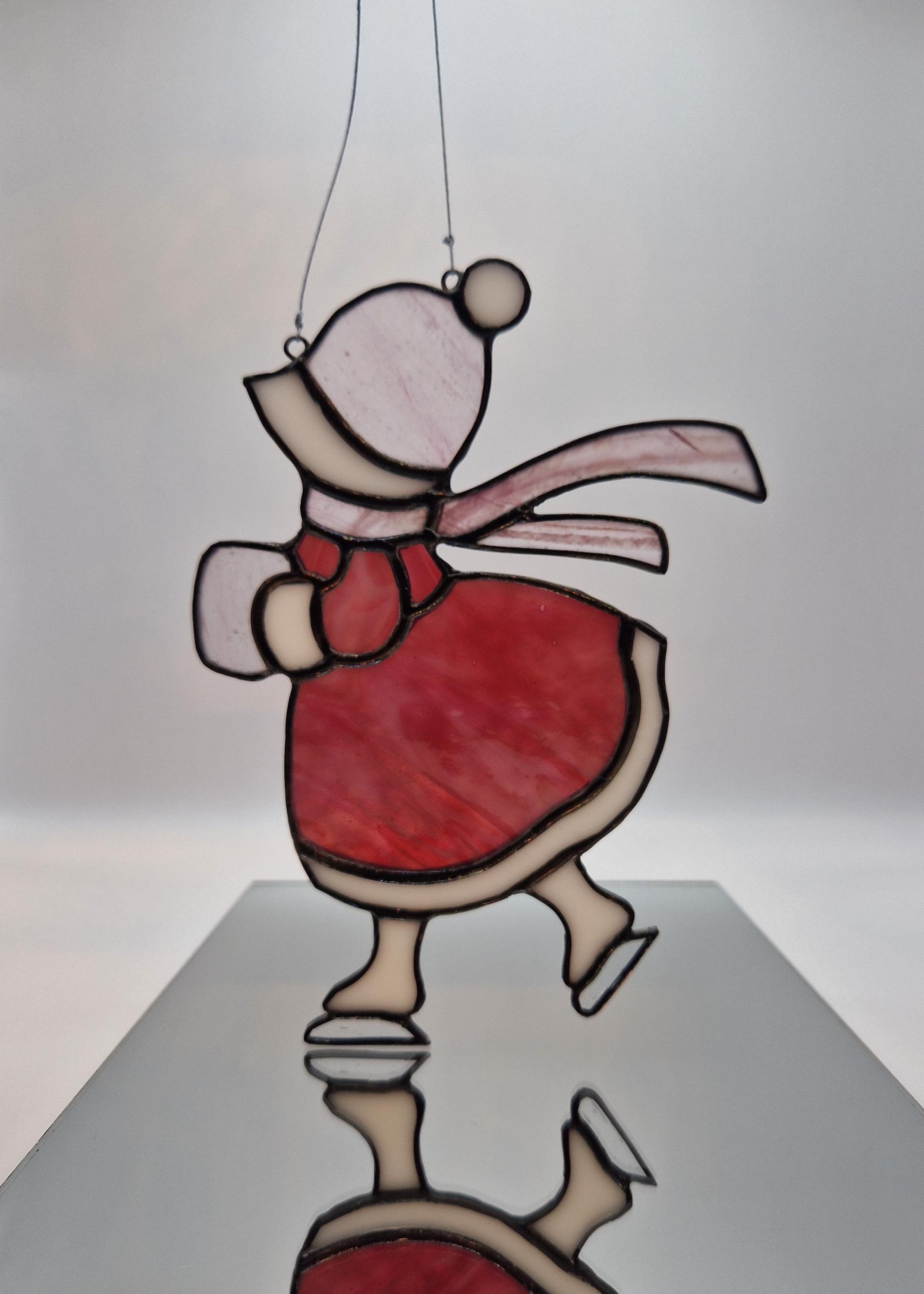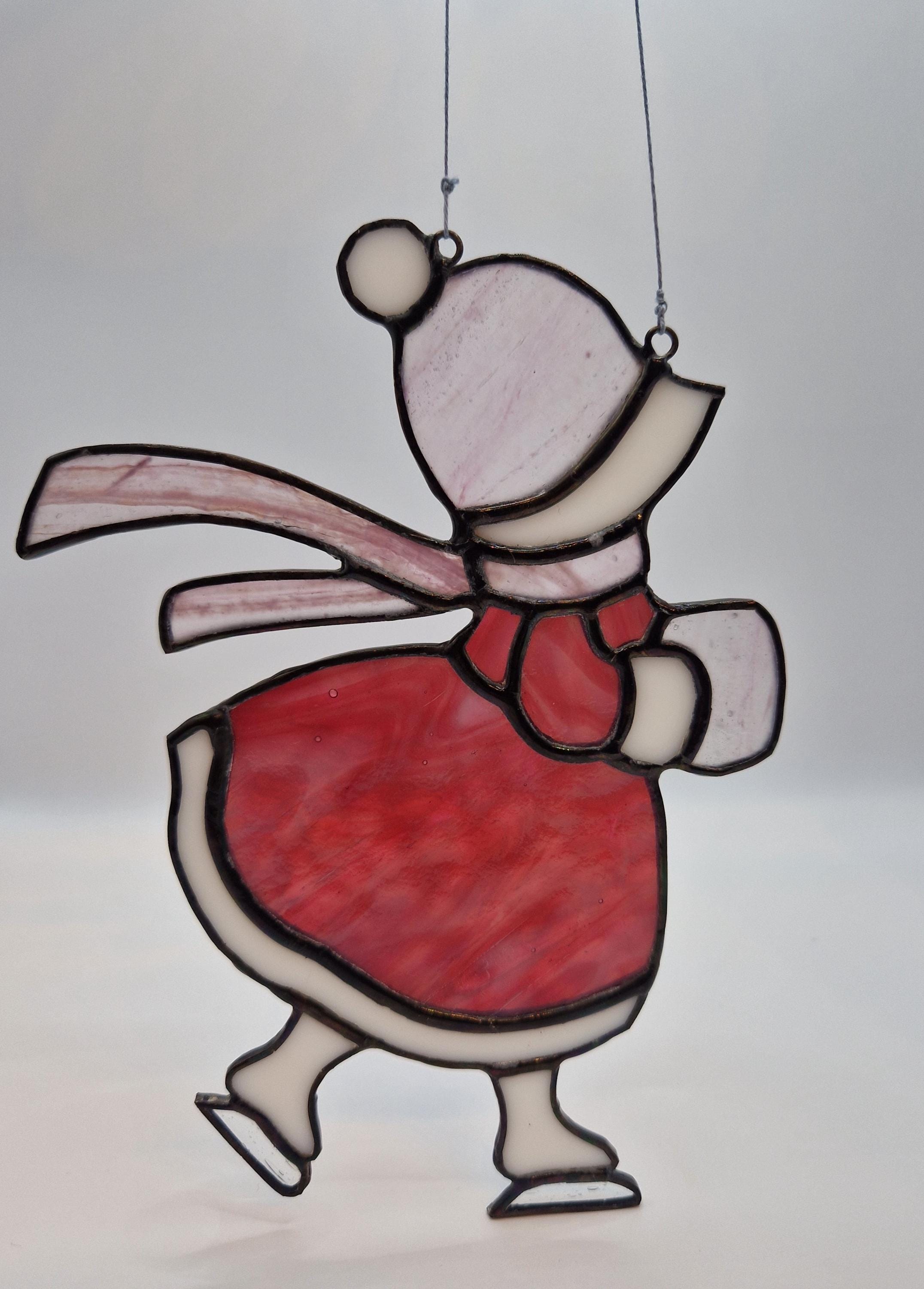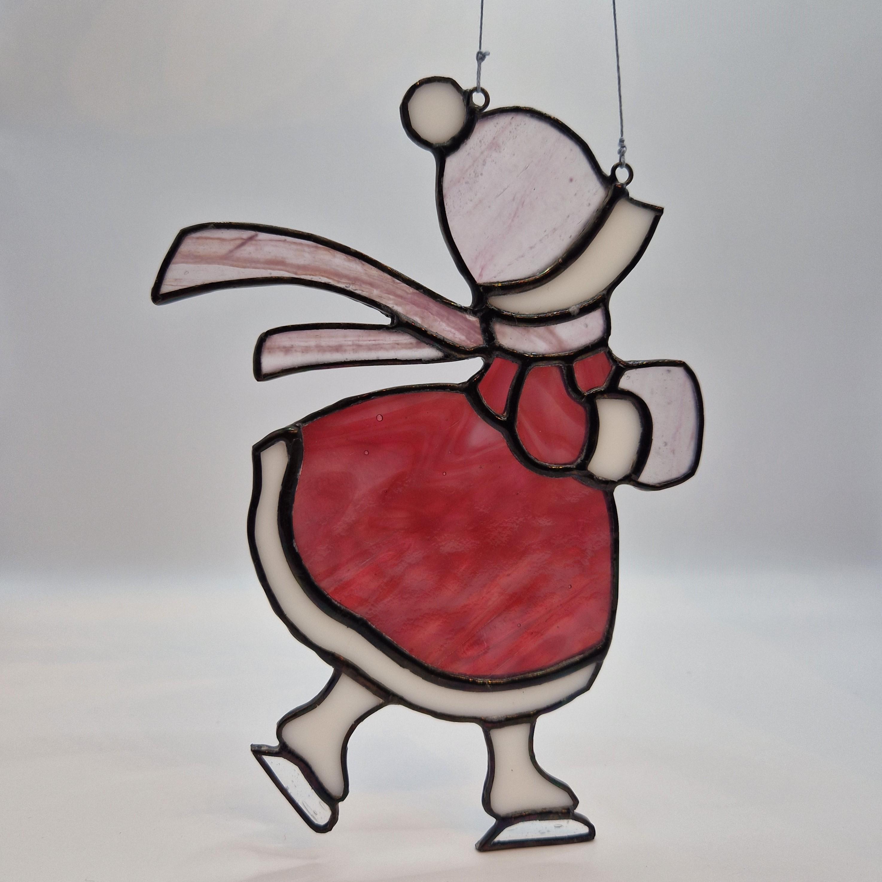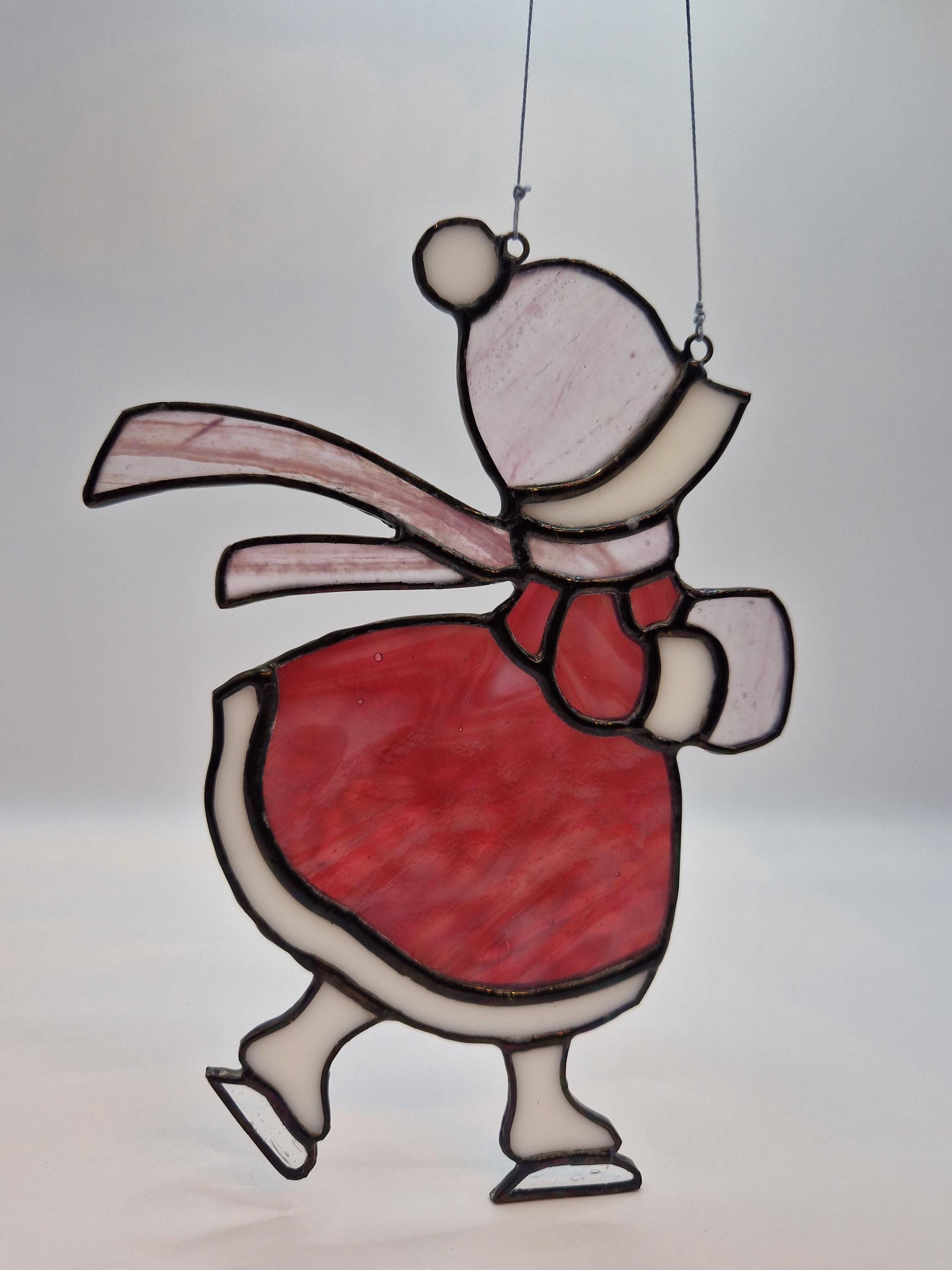 A nostalgic stained glass suncatcher featuring a Victorian girl skating through a winter scene. Handcrafted with antique -style charm, this piece adds warmth and elegance to any window- perfect as a seasonal gift or vintage-inspired decor.