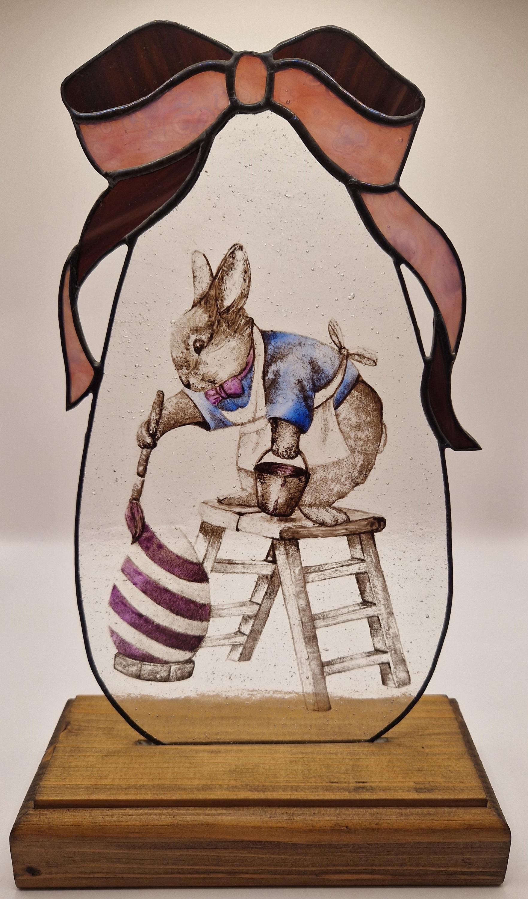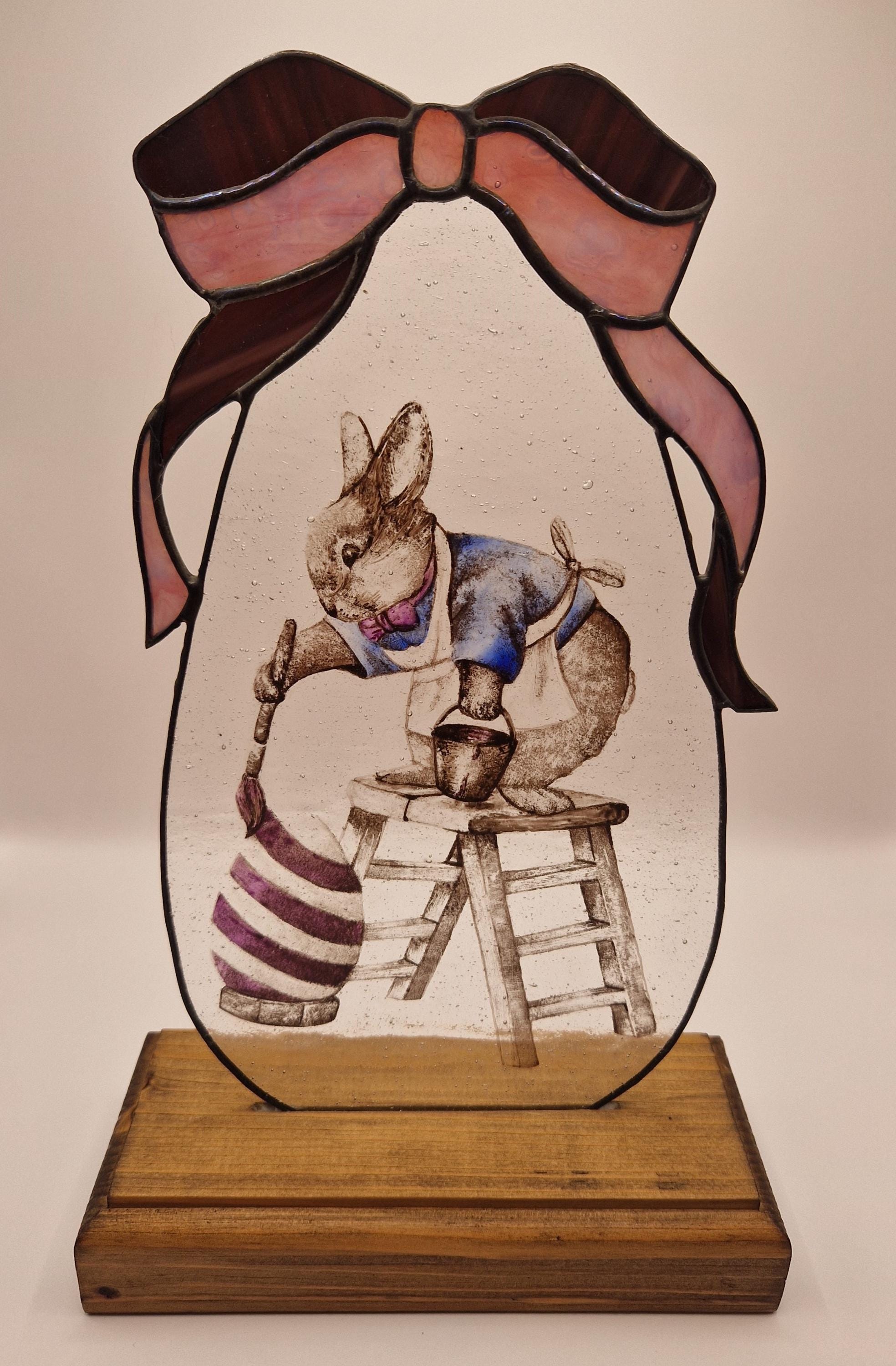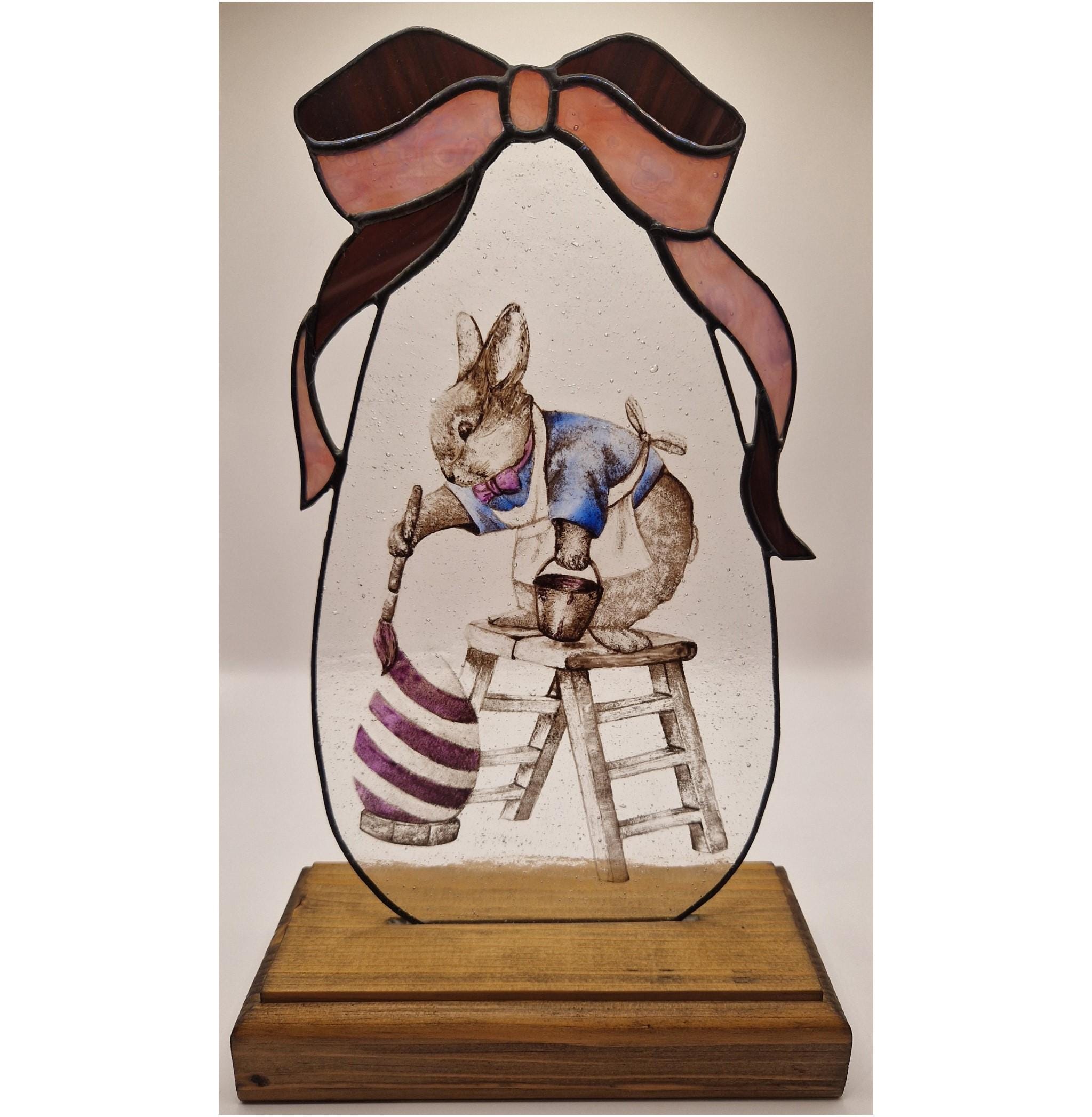 Beautifully, hand painted, stained glass centrepiece of Peter Rabbit painting an Easter egg within an egg. Perfect for bringing magic to any Easter celebration.