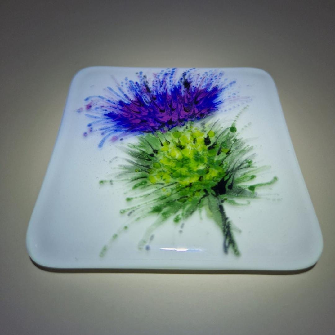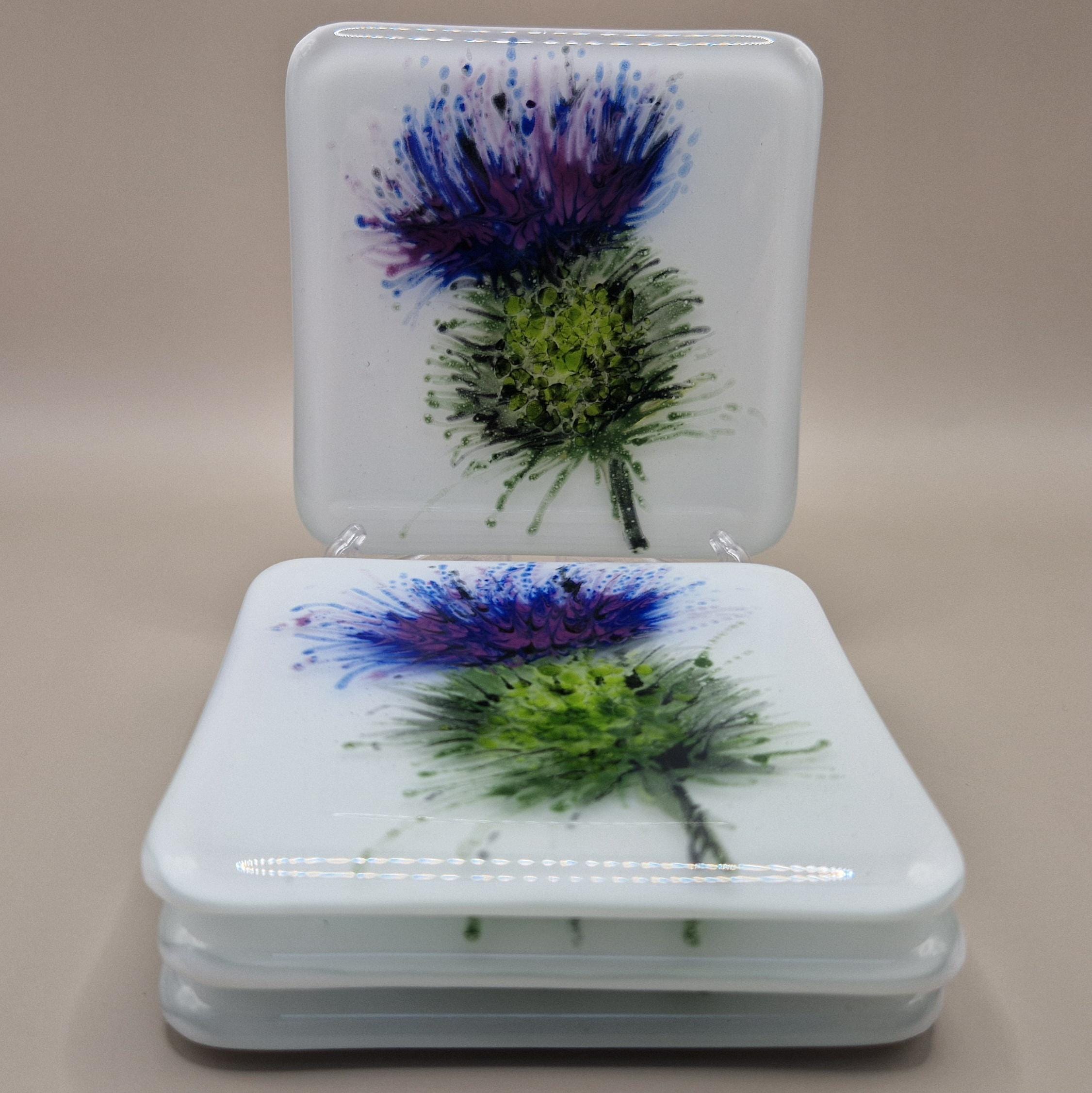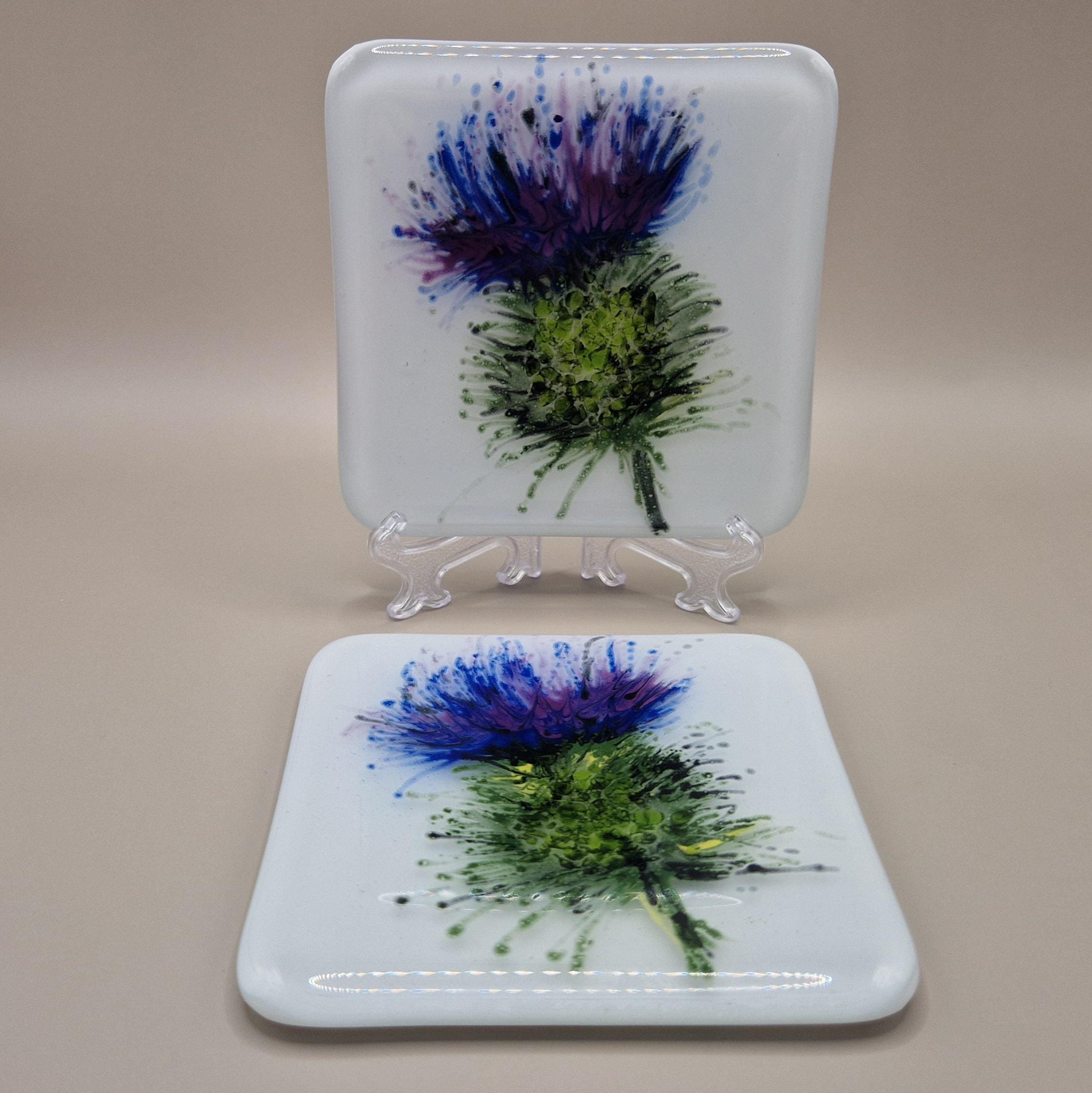 Enjoy a smooth Scotch on a beautiful hand painted Scottish Thistle glass coaster. Unique, hand painted, fused glass coaster with thistle - perfect for a wee dram of scotch to sit on. Each measures 10cmx10cm and is individually painted with care in fused glass, each piece is unique and full of magic.