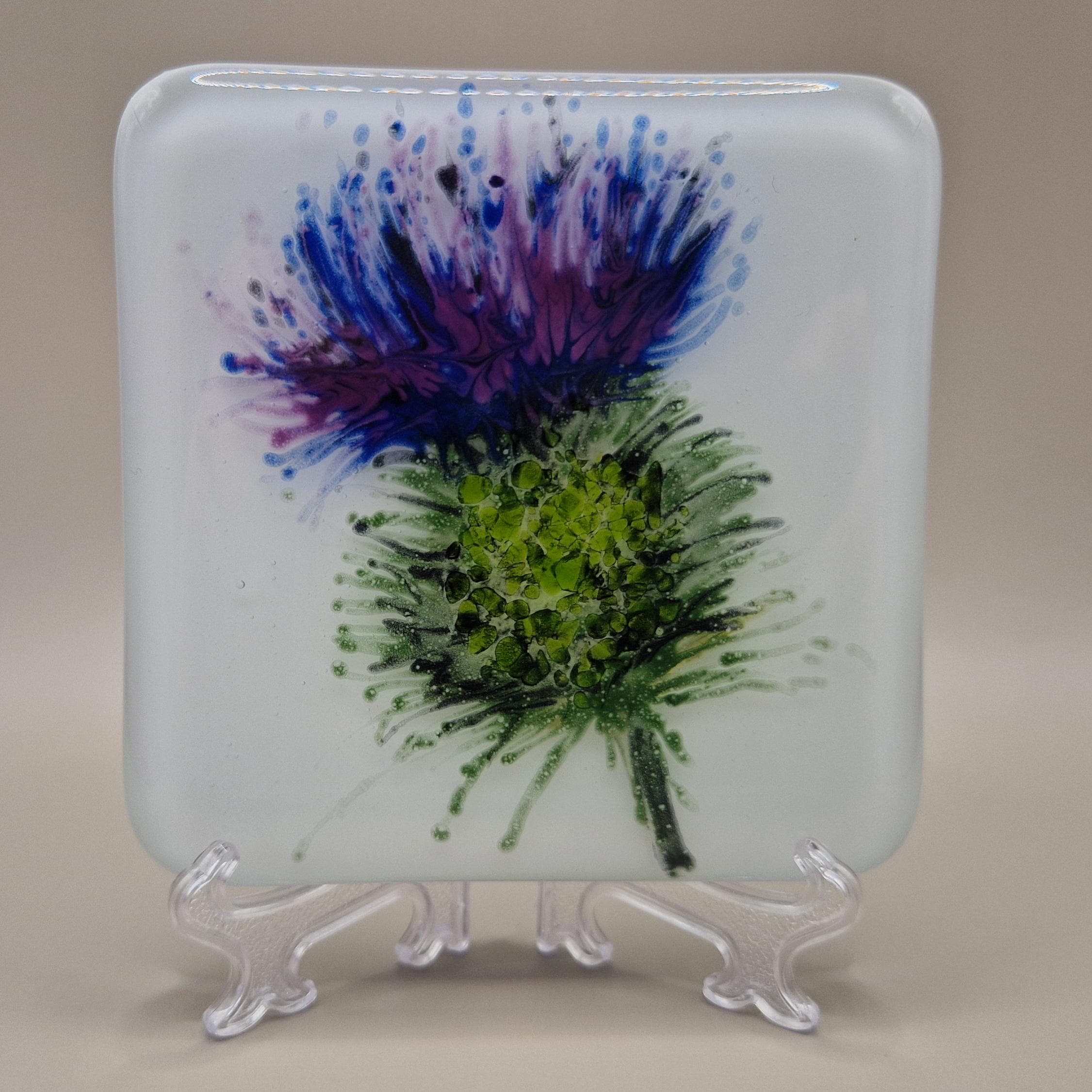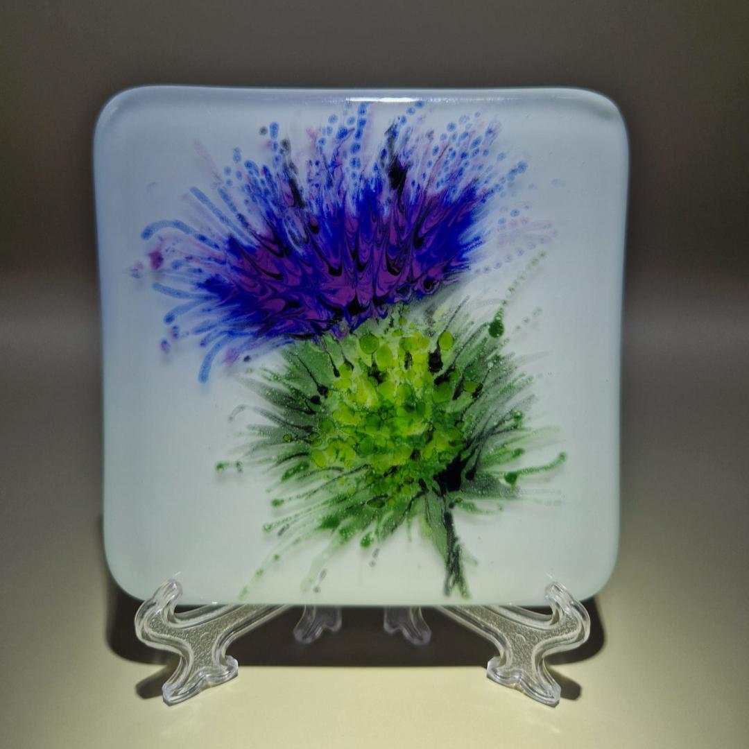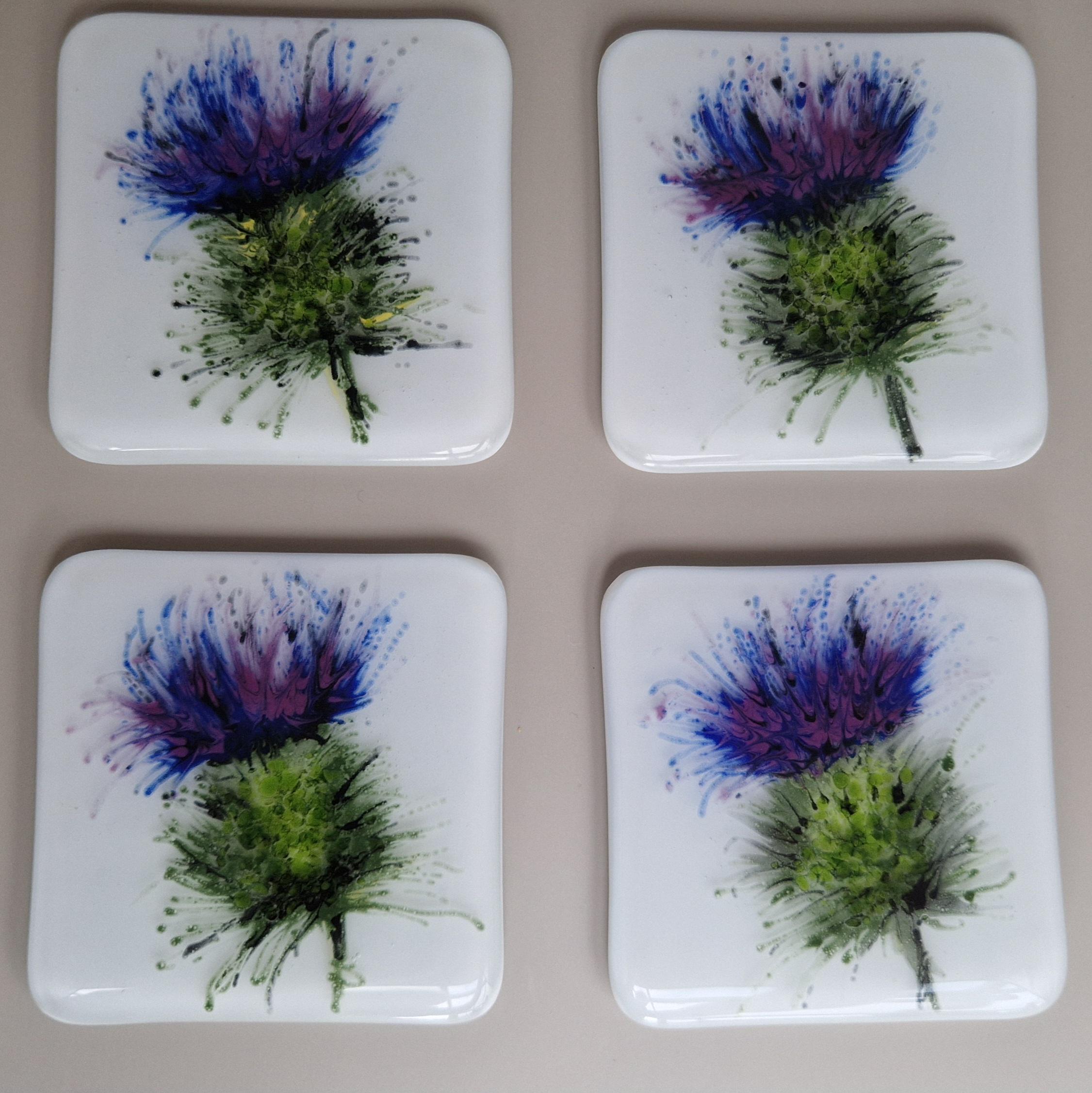Enjoy a smooth Scotch on a beautiful hand painted Scottish Thistle glass coaster. Unique, hand painted, fused glass coaster with thistle - perfect for a wee dram of scotch to sit on. Each measures 10cmx10cm and is individually painted with care in fused glass, each piece is unique and full of magic.