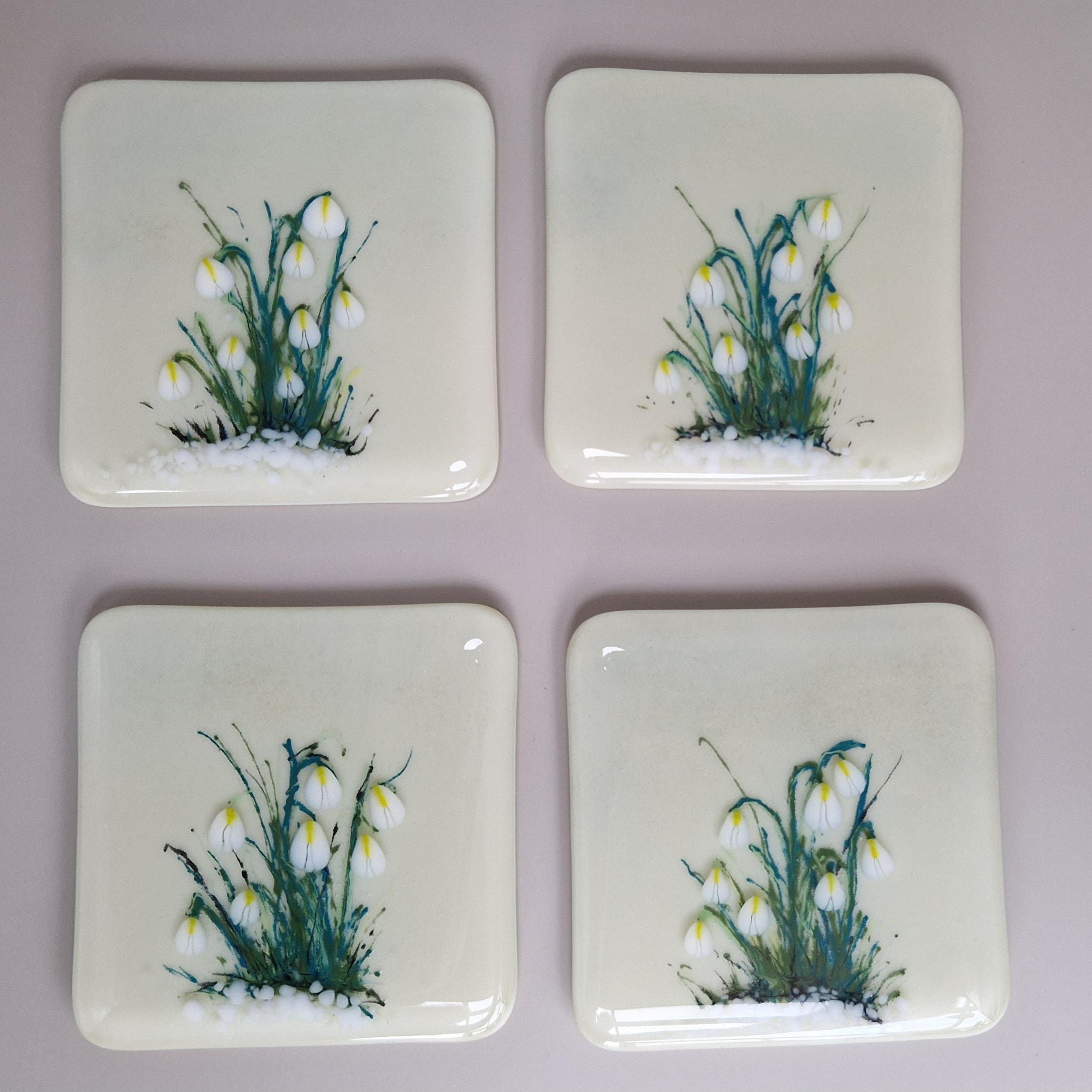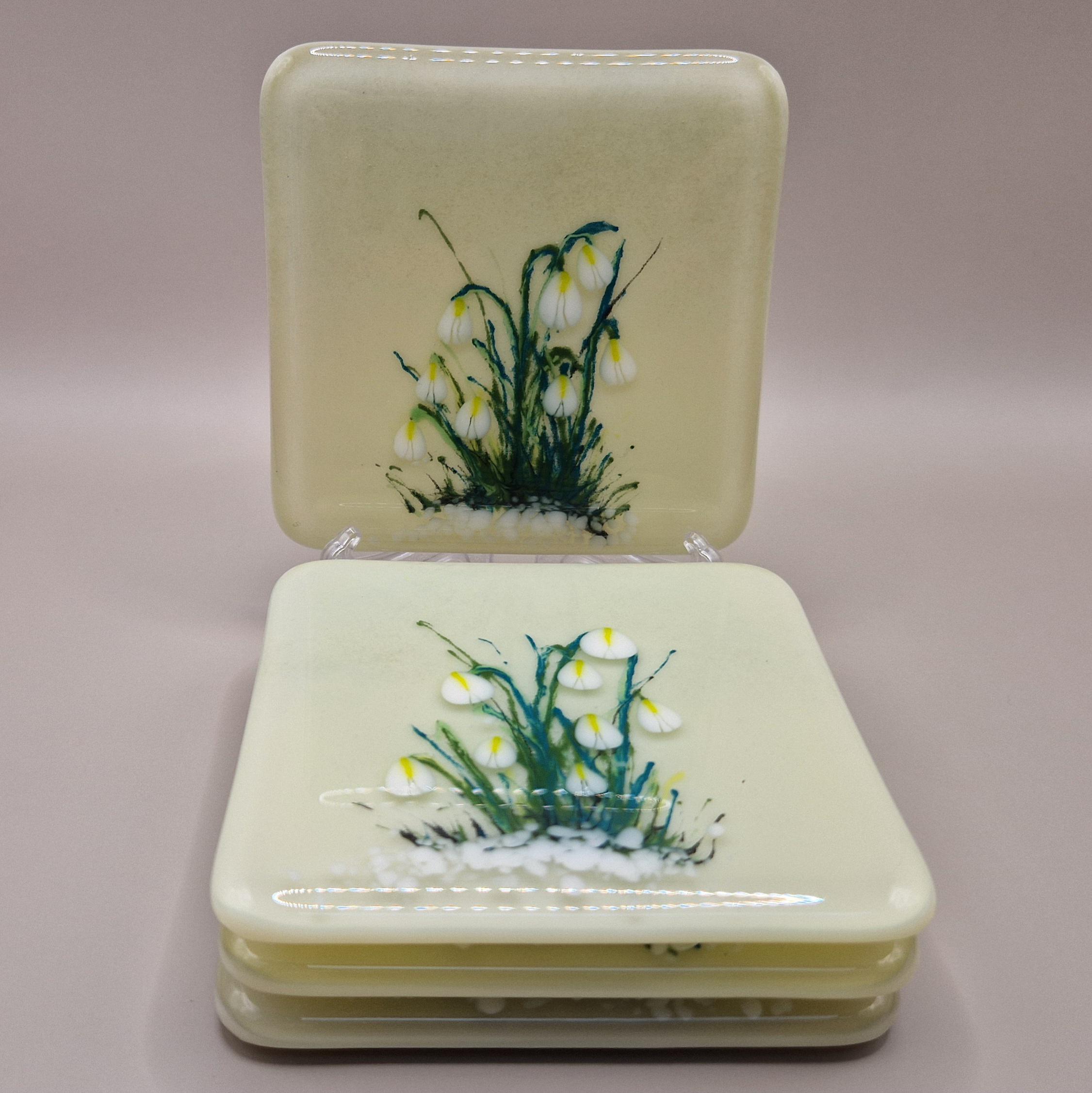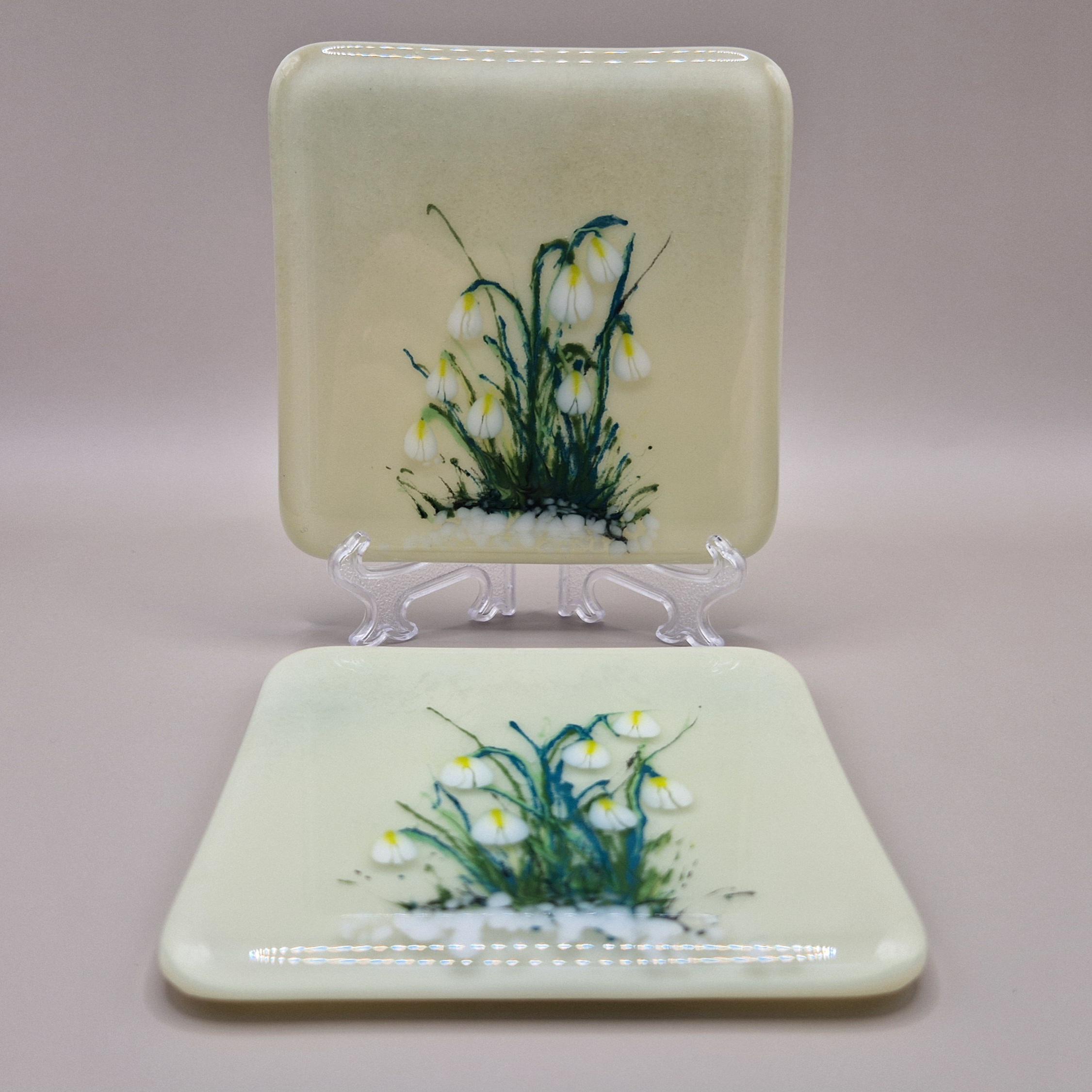 Enjoy a Spring cocktail on a beautiful hand painted Snowdrop glass coaster. Unique, hand painted fused glass coaster with snowdrop - perfect for that spring drink. Each measuring 10cm x 10cm, they are individually painted with care in fused glass. Each piece is unique and full of magic.