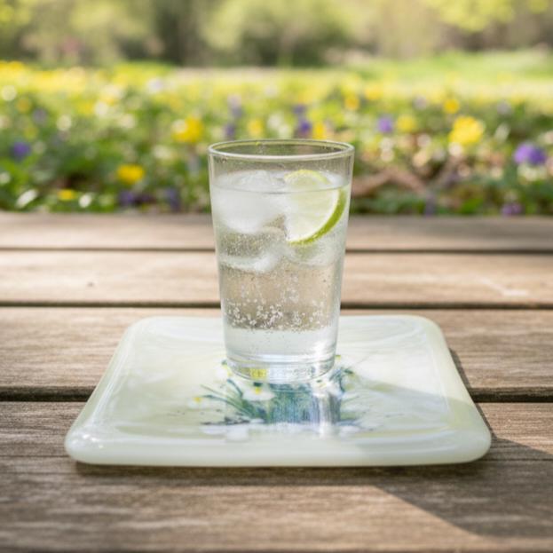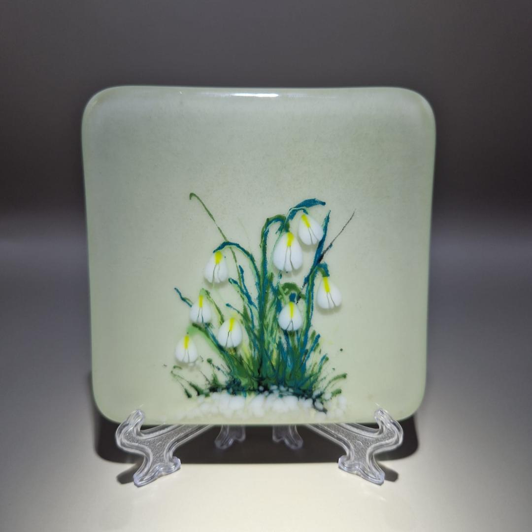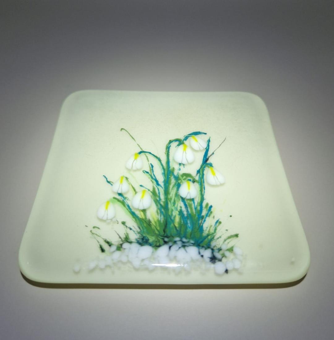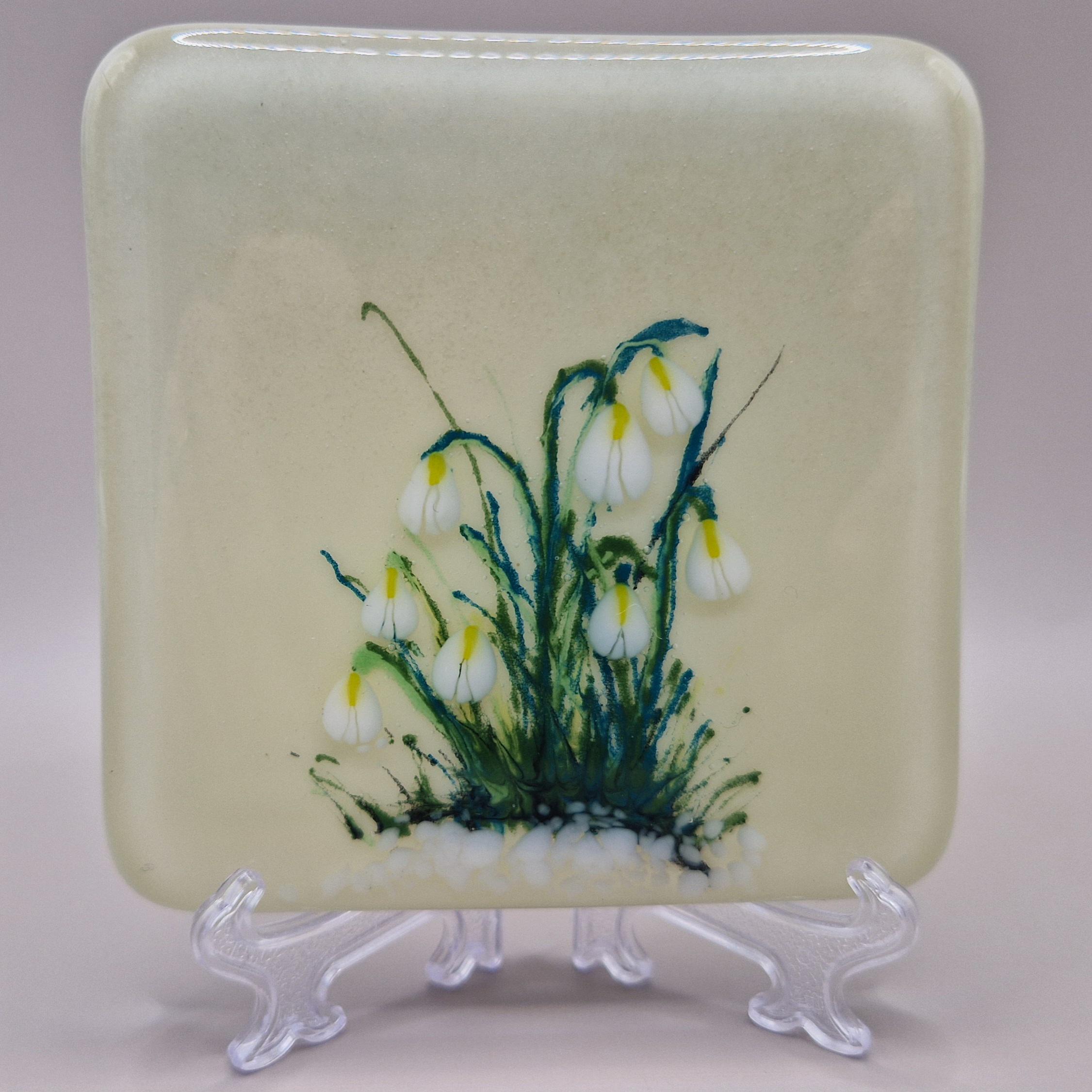 Enjoy a Spring cocktail on a beautiful hand painted Snowdrop glass coaster. Unique, hand painted fused glass coaster with snowdrop - perfect for that spring drink. Each measuring 10cm x 10cm, they are individually painted with care in fused glass. Each piece is unique and full of magic.